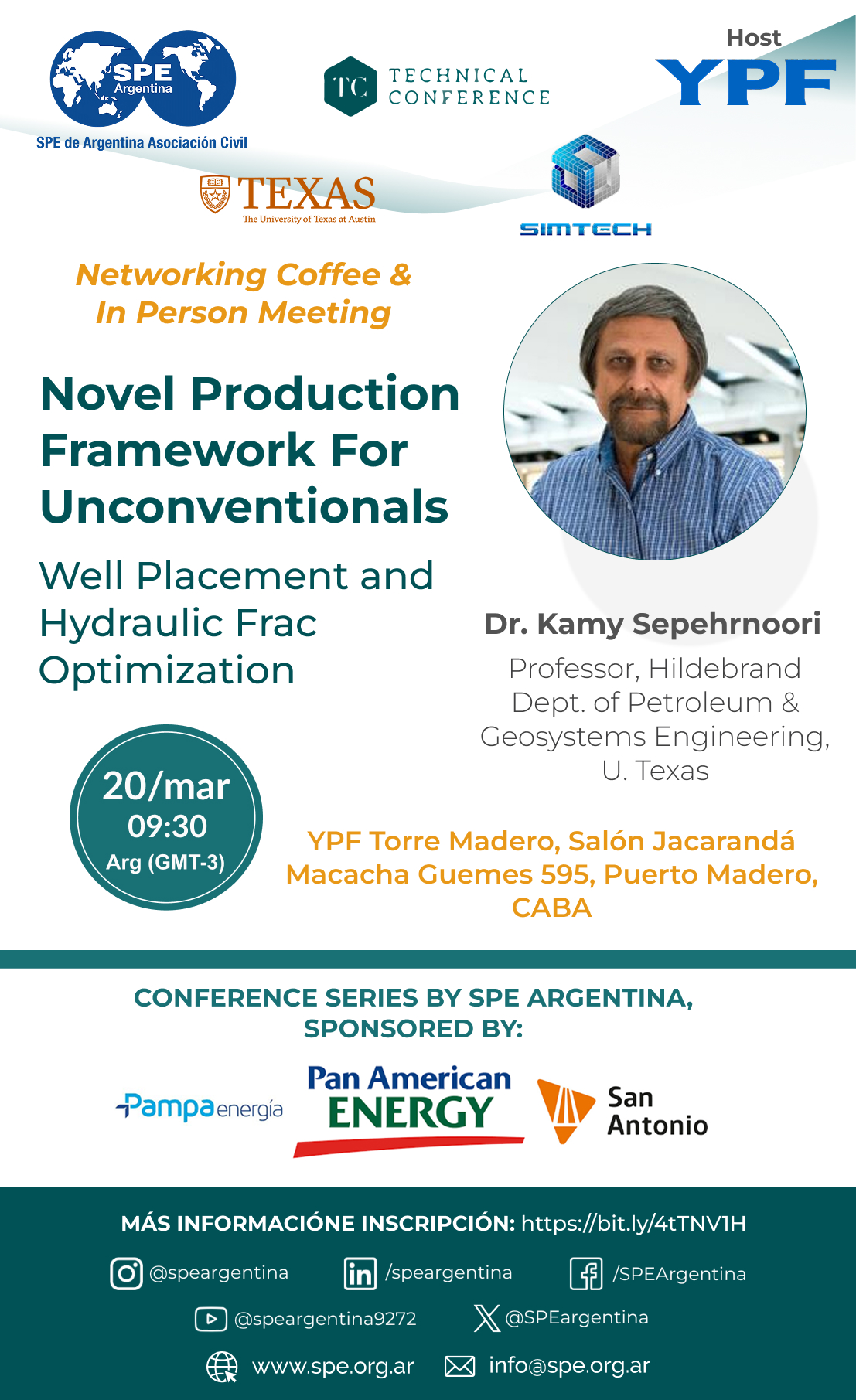 La charla es sobre flujos de trabajo para modelado de subsuelo de manera integral, en reservorios no convencionales. Kamy es experto en el tema y en conjunto con la U. de Texas, vienen desarrollando herramientas ad hoc y presentaran casos reales en US y Vaca Muerta.